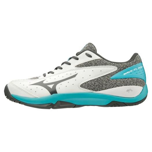 ミズノ(MIZUNO) テニスシューズ ウエーブフラッシュワイド OC 品番:61GB193125 カラー:25:ホワイト×ダークグレー×ライトブルー サイズ:23.0~28.5cm 素材 甲材:人工皮革・合成繊維 底材:合成底 質量:約330g(27.0cm片方) 対象/目的 砂入り人工芝・クレーコート用 インソール:カップインソール(取り外し可) シューズ幅:3E相当の方向け 原産国:ベトナム製