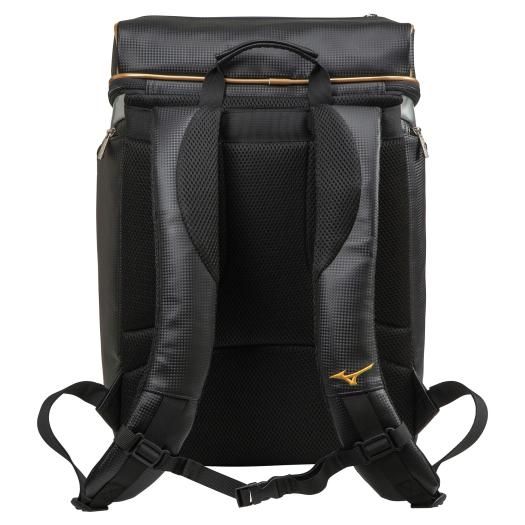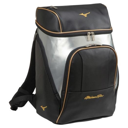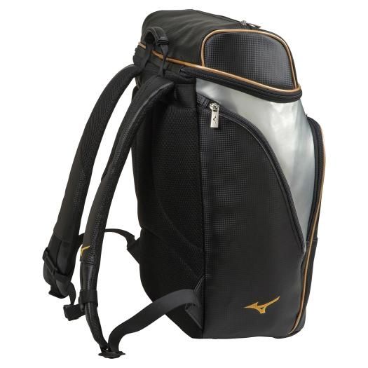 ミズノ(MIZUNO) ミズノプロ バックパック 品番:1FJD040994 カラー:94:ブラック×シルバー サイズ:L34×W19×H51cm 素材:人工皮革(PU)・ナイロン(裏加工PU) 重量:約1040g 容量:約35L 原産国:中国製