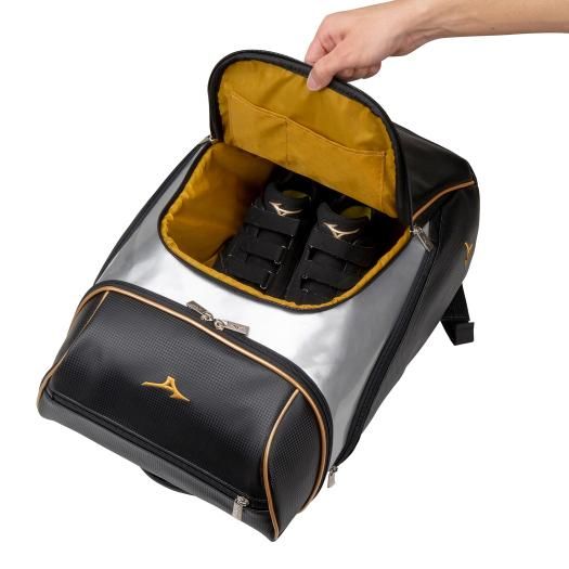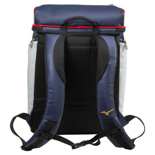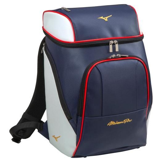 ミズノ(MIZUNO) ミズノプロ バックパック 品番:1FJD040981 カラー:81:パステルネイビー×ホワイト サイズ:L34×W19×H51cm 素材:人工皮革(PU)・ナイロン(裏加工PU) 重量:約1040g 容量:約35L 原産国:中国製