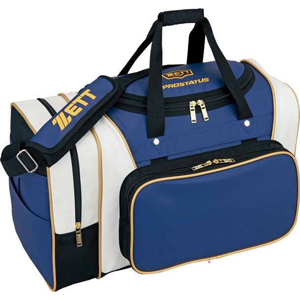 ゼット(ZETT) プロステイタス ミドルバッグ 品番:BAP620 カラー:ブロンズブルー×ホワイト(2011) サイズ:長さ55×高さ33×巾26cm 容量:約51リットル(本体 約40リットル+ポケット 約11リットル) 素材:合成皮革(PVC)、底部・背面:1680Dナイロン 機能・特徴 フロントポケット取り外し式(縦20×横38cm) フロントポケット内マルチポケット付き 左サイドポケット付き 原産国:中国