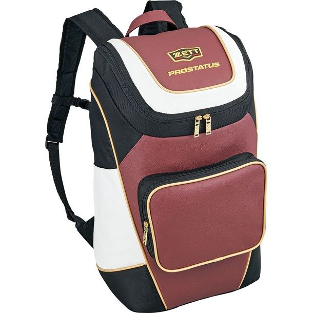 ゼット(ZETT) プロステイタス デイパック 品番:BAP420 カラー:エンジII×ホワイト(6011) サイズ:長さ32×高さ54×巾22cm 容量:約40リットル(本体 約38リットル+ポケット 約2リットル) 素材:合成皮革(PVC)、底部・ショルダー部:1680Dナイロン 機能・特徴 フロントポケット取り外し式(縦19×上辺26cm、下辺22cm) フロントポケット内マルチポケット付き 両サイド挿し込みポケット付き チェストベルト付き 原産国:中国