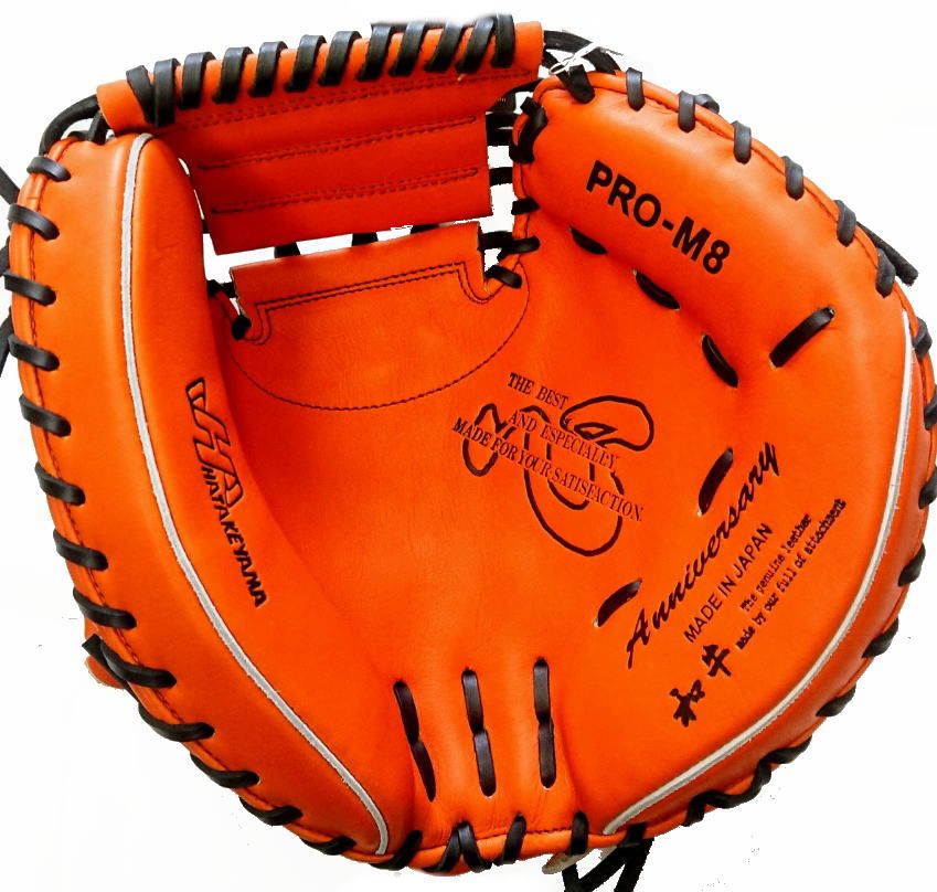 ハタケヤマ(HATAKEYAMA) 硬式野球用 キャッチャーミット 品番:PRO-M8 カラー:オレンジ 左右:右投用 表革:スペシャルジャパンハイド 裏革:和牛革ブラック ロングタイプ指カバー 座ブトンスポンジ axバック採用 日本製