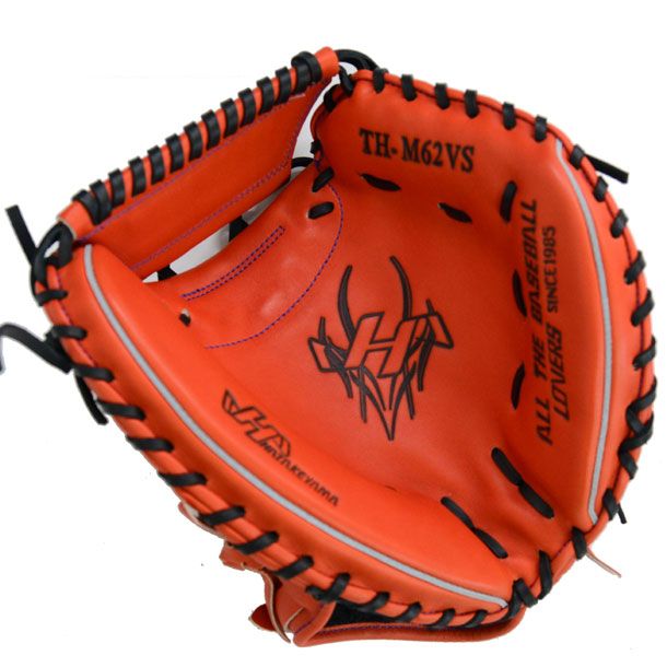 ハタケヤマ(HATAKEYAMA) 軟式野球 キャッチャーミット 品番:TH-M62VS カラー:Vオレンジ 素材 表革:北米ステアハイド 裏革:共牛革 左右:右投用 機能:特徴 シェラームーブ ピンキーパターン ロングタイプ指カバー 基本モデル:M62型 ポジション:捕手用 原産国:台湾