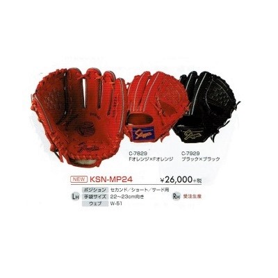 品番:KSG-MP24 カラー:C-7829(Fオレンジ×Fオレンジ)/C-7929(ブラック×ブラック) 左右:右投げ用 ポジション:セカンド用、ショート、サード用 生産国:日本製