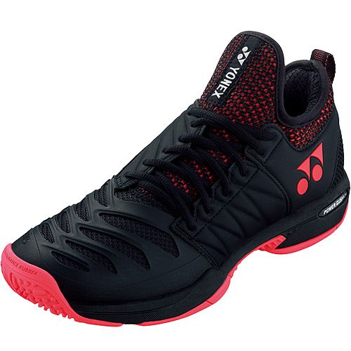 ヨネックス(YONEX) テニスシューズ パワークッションフュージョンレブ3MGC 品番:SHTF3MGC カラー:ブラック(007) サイズ:22.0〜29.0cm 素材:アッパー/合成繊維+合成樹脂、ミッドソール/合成樹脂、アウトソール/ゴム底 仕様:ローカット、3E設計 用途:クレー/砂入り人工芝コート 機能1:パワークッションプラス/ヨネックス独自開発の軽量衝撃吸収材「パワークッション」に弾性のある特殊な樹脂を添加。従来の軽量性は保ちつつ、高い衝撃吸収性(従来比25%アップ)を実現。格子状に「+型」の溝を最適な間隔と深さで配置し、さらなる反発性(従来比12%アップ)を達成しました。 機能2:新設計フレクションアッパー/シューレースを、締め込みの圧力が集中しやすい舟状骨〜楔状骨付近を避けてレイアウトすることで、圧力を足全体に分散させ、包み込まれるようなフィット感を実現しました。 機能3:インナーブーティ構造/中足部からかかと部にかけて、伸縮素材で足を包み込み柔らかなフィット感を実現。 原産国:ベトナム