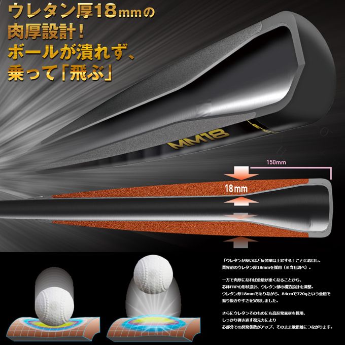 エスエスケイ(SSK) 一般軟式野球用バット FRP製 MM18 品番:SBB4023 カラー:ブラック サイズ:83cm/700g平均、84cm/720g平均、85.5cm/750g平均 素材:FRP 最大経:平均φ69mm バランス:トップバランス バットケース付き 機能・特徴 「ウレタンが厚いほど反発率は上昇する」ことに着目し、 業界初のウレタン厚18mmを採用(※SSK社調べ)。 一方で肉厚になれば重量が重くなることから、 芯棒FRPの形状設計、ウレタン部の構造設計を調整。 ウレタン厚18mmでありながら、84cmで720gという重量で 振り抜きやすさを実現しました。 さらにウレタンそのものにも高反発素材を採用、 しっかり弾き返す復元力により 芯部分での反発係数がアップ、そのまま飛距離につながります。 生産国:日本