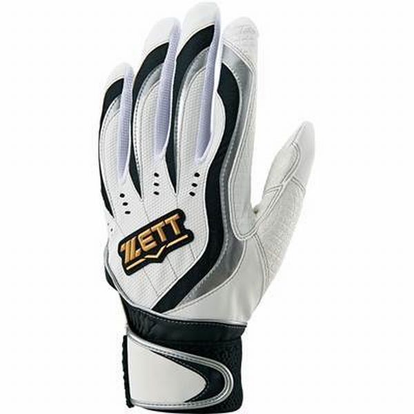 ゼット(ZETT) バッティンググローブ インパクトゼット 品番:BG997 カラー:ホワイト/ブラック(1119) サイズ:S(22-23cm)、M(24-25cm)、L(26-27cm) 素材 甲側:合成皮革 掌側:合成皮革(エンボス加工) 当て革:合成皮革(エンボス加工) 機能:ウォッシャブル
