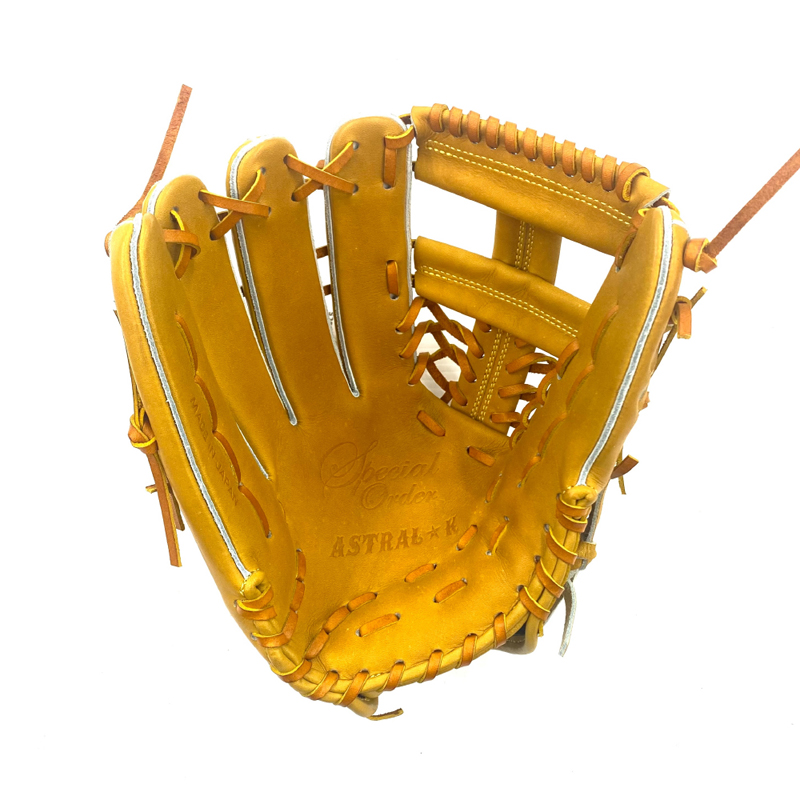 ASTRAL K 硬式用外野手グラブ 品番:AST007 バックスタイル:レギュラー(親指とベルト一体型) カラー 本体:ライトコルク(16) 裏平革:ブラック(90) レースカラー:コルク(27) 縫い糸:イエロー(15) マーク(直刺繍):ブラック×影ゴールド サイズ:RH(左投用) 素材 表:天然皮革(High Leather) 平裏:人工皮革(スムースタッチ) ウェブ:W-21(外野手用) 付属品:専用袋 生産国:日本