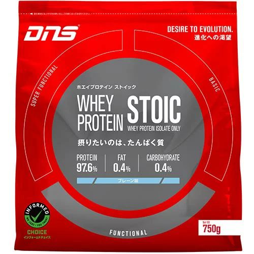 ディーエヌエス(DNS) ホエイプロテインストイック プレーン 750g 1食(25g)あたり エネルギー:94kcal たんぱく質:23.1g 脂質:0.1g 炭水化物:0.1g 食塩相当量:0.4g たんぱく質(無水物換算値):24.4g 原材料 ホエイたんぱく(乳成分を含む) 乳化剤 増粘剤(グァーガム) ※牧草を食べて育った健康な牛のグラスフェッド・ホエイを100%使用しています。 ※遺伝子組み換え作物(GMO)を使用していません。 内容量 : 750g 製造工場 : 国内ISO取得工場にて製造 賞味期限 : 製造後24か月 保存方法 : 高温、多湿を避けて保存してください 原産国 : ニュージーランド