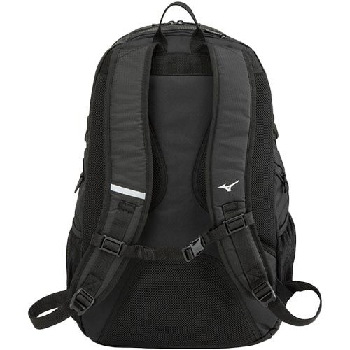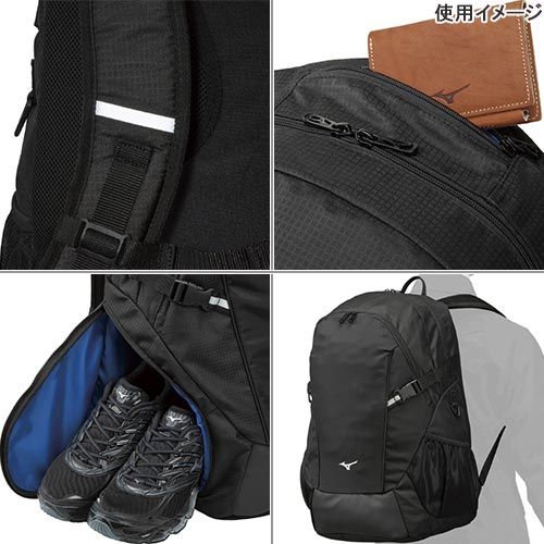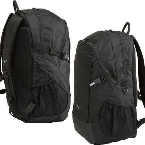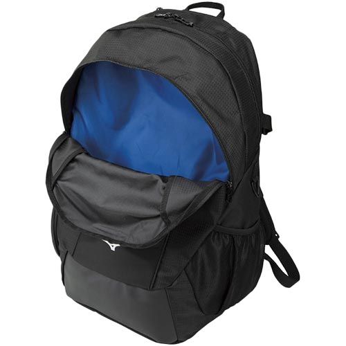 ミズノ(MIZUNO) バックパック チームバッグパック40-6 品番:33JD010109 カラー:ブラック(09) サイズ:L36×W24×H54cm 素材:ポリエステル(裏加工PU)・ナイロン(裏加工PU)・合成皮革(PU) 容量:約40L 重量:約850g 原産国:ベトナム製