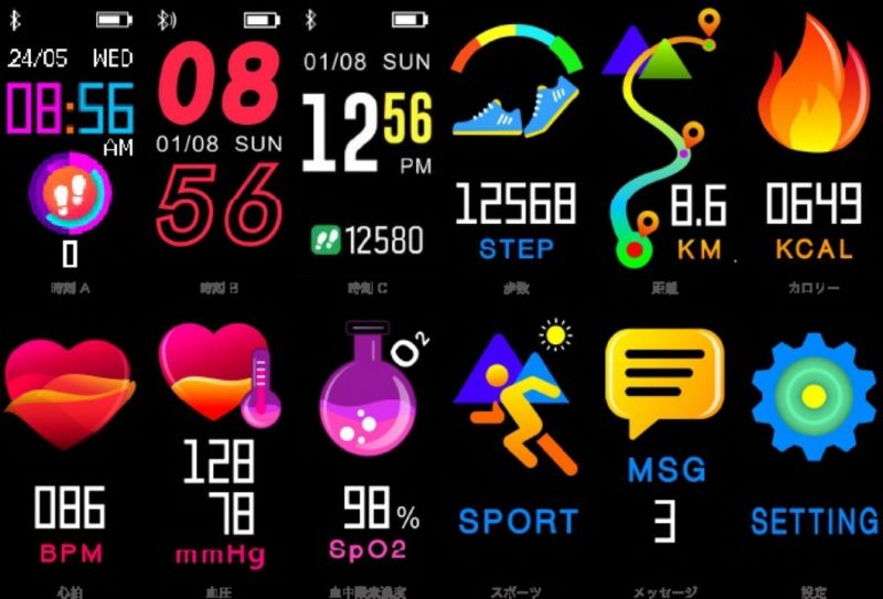 機能:時刻、歩数、距離、カロリー、心拍、 血圧、睡眠計測、血中酸素濃度、着信通知、 時計探し、スポーツモード、リモート自撮り、 ストップウォッチ、ファインドフォン、座り過ぎ 防止タイマー