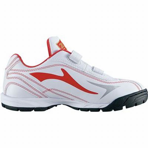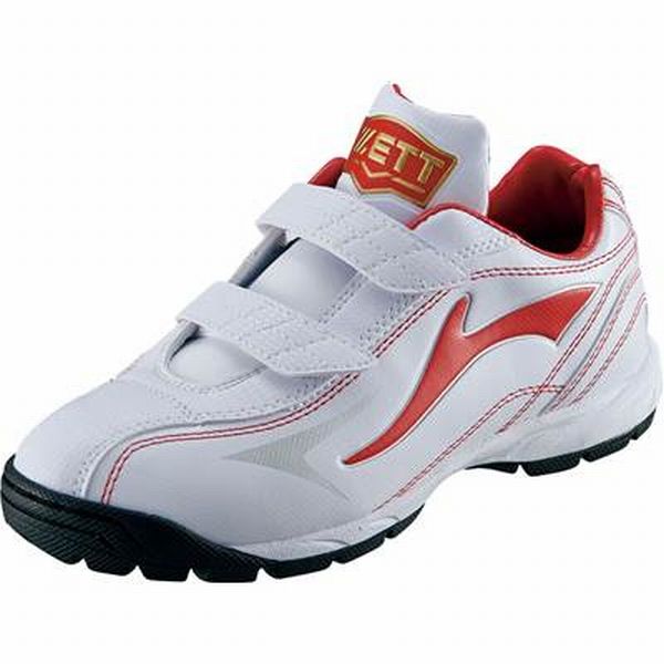 ゼット(ZETT) 野球 ジュニアトレーニングシューズ ランゲット DX2 品番:BSR8206J カラー:1164:ホワイト×レッド サイズ:19.0、20.0、21.0〜23.0cm 素材 アッパー本体:人工皮革製(エナメル) 補強:人工皮革製(エナメル) アウトソール:合成ゴム製 ミッドソール:熱成型EVAスポンジ 機能:屋外の土のグランドでも滑りにくいマルチスタッドタイプのアウトソール 原産国:中国