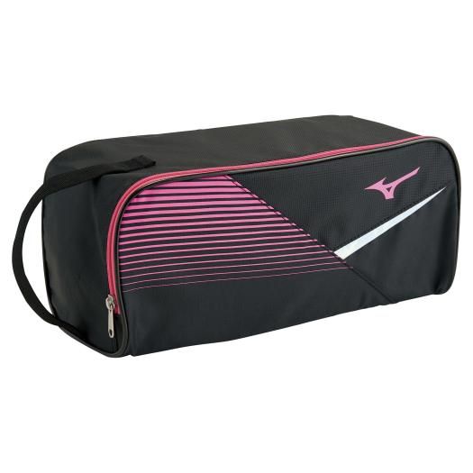 ミズノ(MIZUNO) シューズケース 品番:33JM042297 カラー:97:ブラック×ピンク 素材:ポリエステル(裏加工PU) サイズ:L34×W15×H16cm 重量:約100g 原産国:ベトナム製