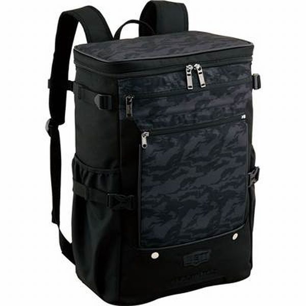 ゼット(ZETT) プロステイタス デイパック 品番:BAP4020 カラー:ブラックカモ(1900C) 素材:合成皮革(PVC)、1680Dナイロン 機能:フロントパーツ取り外し式、フロントファスナーポケット付き、両サイド挿し込みポケット付き、チェストベルト付き サイズ:長さ33×高さ50×巾18cm 容量:約30L 原産国:中国