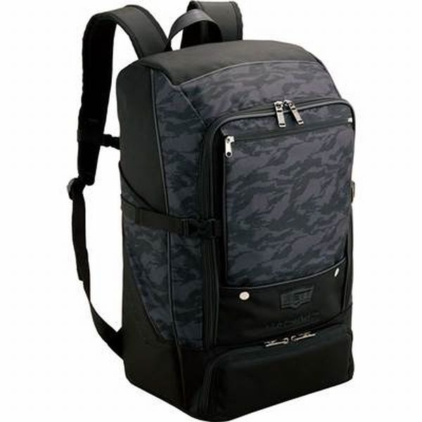ゼット(ZETT) プロステイタス デイパック 品番:BAP6020 カラー:ブラックカモ(1900C) 素材:ポリエステル、合成皮革(PVC)、1680Dナイロン 機能:フロントパーツ取り外し式、底部シューズポケット付き、両サイドポケット付き、チェストベルト付き サイズ:長さ32×高さ55×巾24cm 容量:約42L 原産国:中国