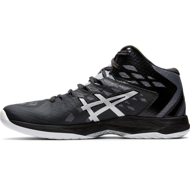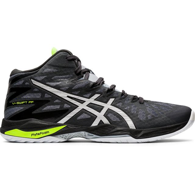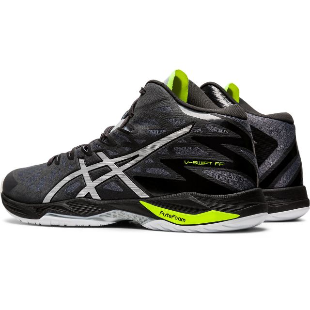 アシックス(asics) バレーボールシューズ V-SWIFT FF MT 2 品番:1053A018 カラー:GRAPHITE GREY/PURE SILVER(020) サイズ:22.5~29.0cm 甲材(アッパー):合成繊維×合成樹脂+合成皮革 底材(ソール):ゴム底 カット:ハイカット 足幅:2E 片足重量:約315g(27.0cm) 生産国:ベトナム