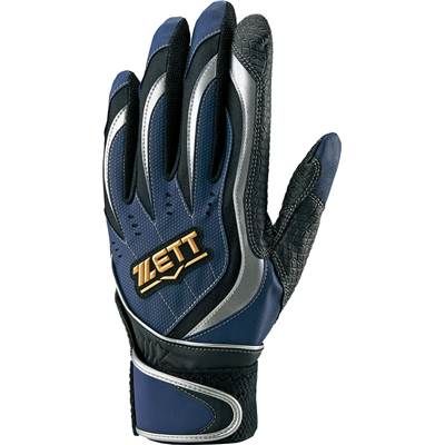 ゼット(ZETT) バッティンググローブ 両手用 インパクトゼット 品番:BG997 カラー:ネイビー/シルバー(2913) サイズ:S(22-23cm)、M(24-25cm)、L(26-27cm) 素材 甲側:合成皮革 掌側:合成皮革(エンボス加工) 当て革:合成皮革(エンボス加工) 機能:ウォッシャブル
