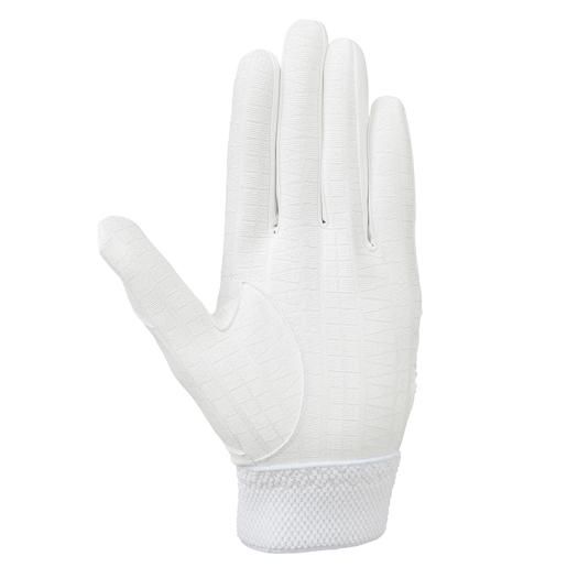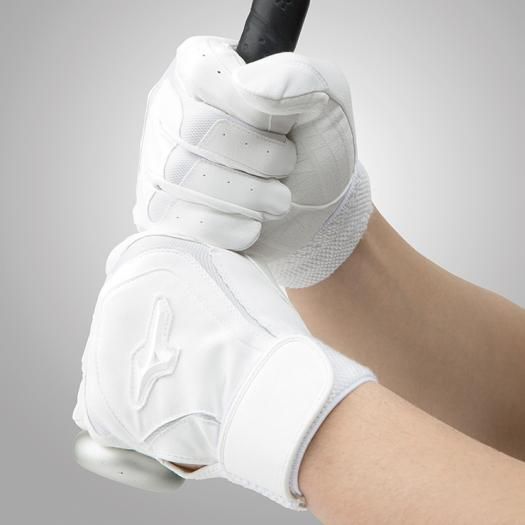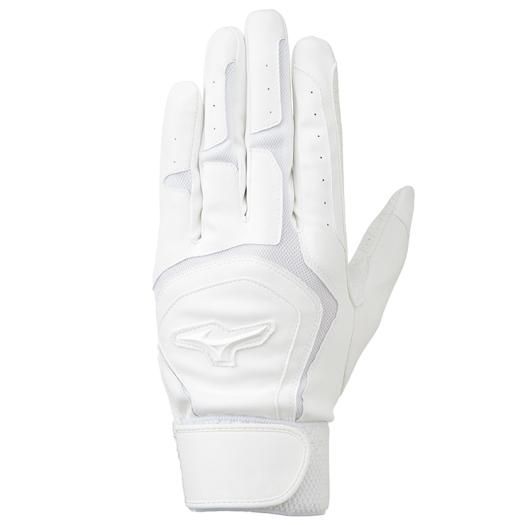 ミズノ(MIZUNO) バッティング手袋 両手用 品番:1EJEH15010 カラー:ホワイト×ホワイト(01) サイズ:S(22~23cm)、M(24~25cm)、L(26~27cm)、LL(28~29cm) 素材:掌部/人工皮革(シリコン加工)、甲部/合成皮革、ナイロン、ポリエステル 掌シリコン加工 機能・特徴 3Dカット 単独水洗い可 原産国:インドネシア製