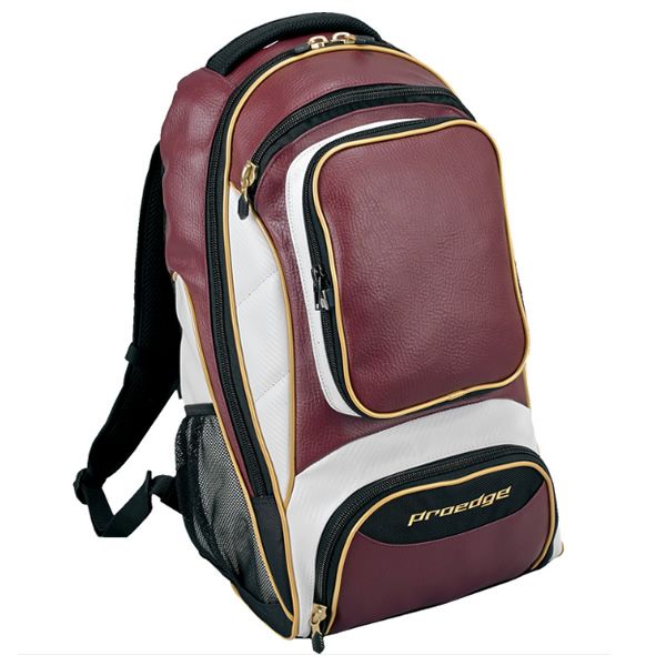 エスエスケイ(SSK) プロエッジ バックパック 品番:EBA1009 カラー:エンジ×ゴールド(2238) 素材:合成皮革(PVC) サイズ:長さ33×高さ54×幅21cm(容量:約35L)、前ポケット:縦24.5×横19cm