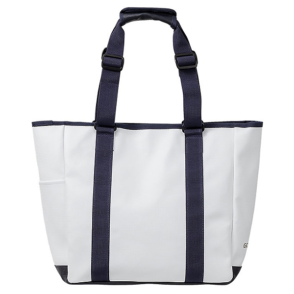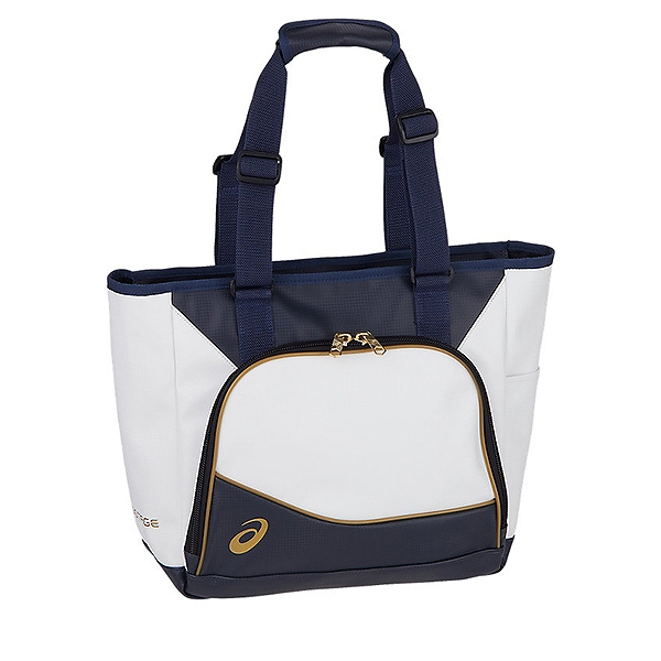アシックス(asics) ゴールドステージ トートバッグM 品番:3123A529 カラー:ホワイト×ネイビー(104) サイズ:W36.5×H34×D16cm 前ポケットサイズ:W33×H23.5cm 容量:約24L 素材:合成皮革 原産国:ベトナム
