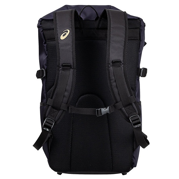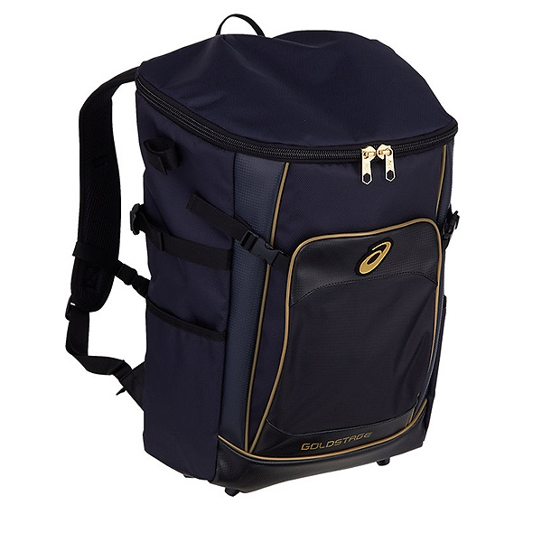 アシックス(asics) ゴールドステージ バックパック 品番:3123A528 カラー:ネイビー(410) 素材:ポリエステル・合成皮革 サイズ:W35×H52×D18cm 前ポケットサイズ:W22×H24cm 容量:約32L 機能・特徴 バット収納ポケット 生産国:ベトナム