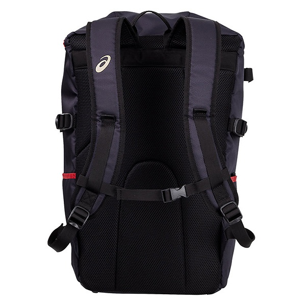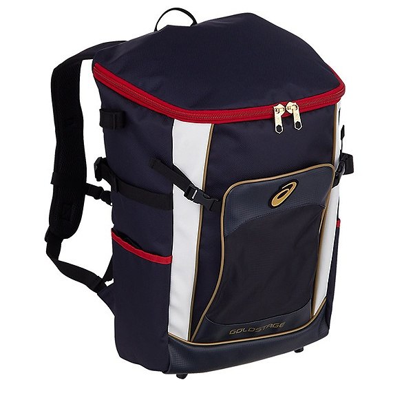 アシックス(asics) ゴールドステージ バックパック 品番:3123A528 カラー:ネイビー×レッド(412) 素材:ポリエステル・合成皮革 サイズ:W35×H52×D18cm 前ポケットサイズ:W22×H24cm 容量:約32L 機能・特徴 バット収納ポケット 生産国:ベトナム