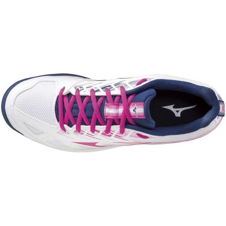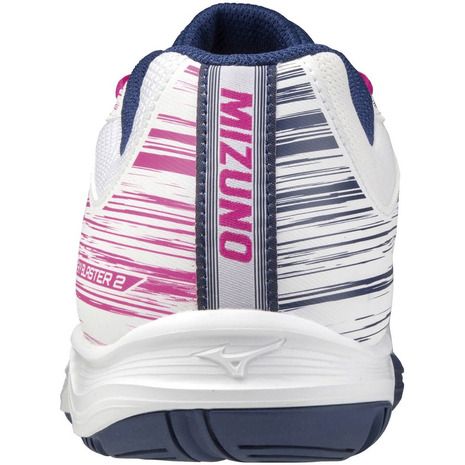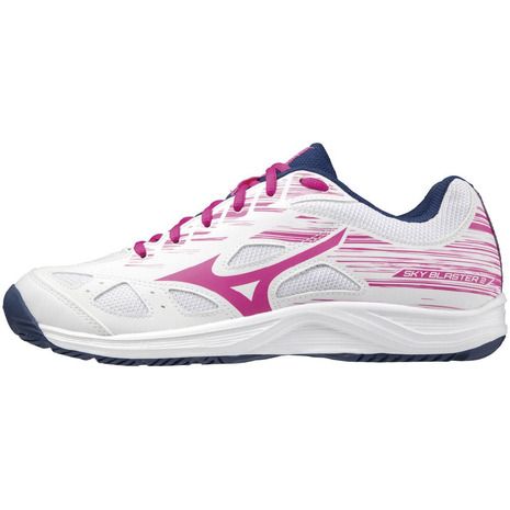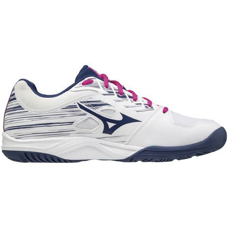 ミズノ(MIZUNO) バドミントンシューズ スカイブラスター 2 品番:71GA204564 カラー:ホワイト×ピンク×ネイビー(64) サイズ:22.5~25.5cm 素材 甲材:人工皮革、合成繊維 底材:合成底 インソール:カップインソール(取り外し可) 質量:約275g(27.0cm片方) シューズ幅:2E相当の方向け 原産国:ベトナム製