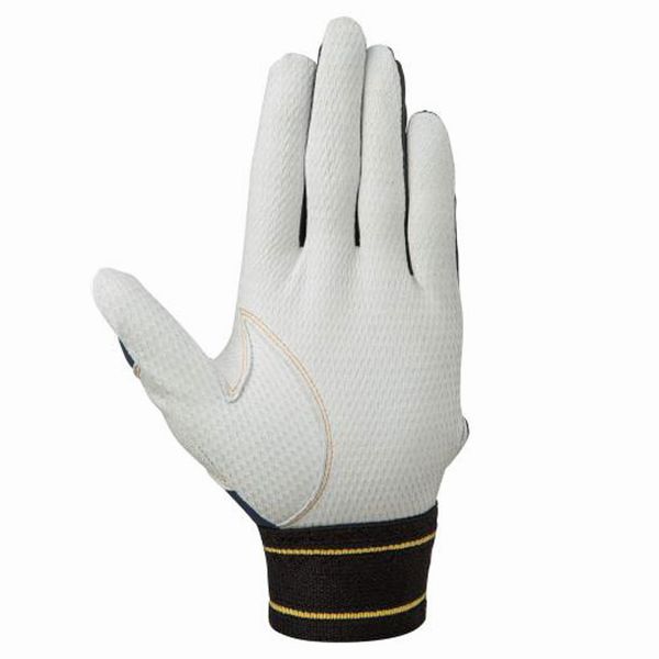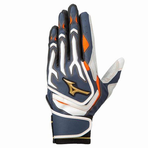 ミズノ(MIZUNO) ミズノプロ シリコンパワーアーク W バッティング手袋(両手用) 品番:1EJEA07814 カラー:14:ネイビー×ホワイト×オレンジ サイズ:23〜27cm 素材 掌部:羊革(型押し) 甲部:合成皮革、ポリエステル、ナイロン、ポリウレタン 機能・特徴 パワーアークライン パワーアーク専用Wベルト構造 デュアルテンションベルト 指先独自縫製 インデックス独自補強 ダイヤエンボスシープレザー 原産国:ベトナム製、フィリピン製