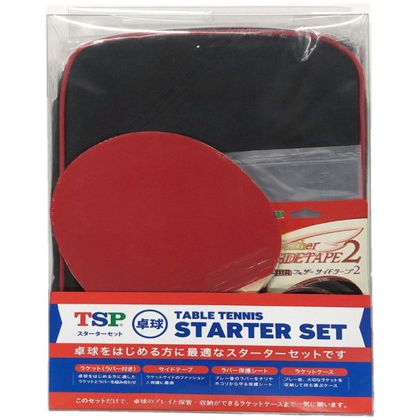 TSP(ティーエスピー) 卓球 スターターセット5点セット 貼り上げ済みラケット+ケース+ボール3球+サイドテープ+保護シート付 品番:025837-0040(レッド) ラケット:026154(グリップ形状:FL) ラバー:020501 ケース:040513 ラバー保護シート:044120 サイドテープ:044151 ボール:014049 ラケット商品名:スタッシュ ラケット素材:5枚合板(木材5枚) ラケット打球感:ミッド ラケットスピード:ミッド ラケット重量:85±重量(g)※ラケットのみの重さです ラケット厚:5.6mm ラケットサイズ:157mm×150mm グリップサイズ:長100mm×厚23mm(FL) 原産国:中国