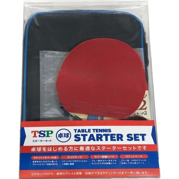 TSP(ティーエスピー) 卓球 スターターセット5点セット 貼り上げ済みラケット+ケース+ボール3球+サイドテープ+保護シート付 品番:025837-0120(ブルー) ラケット:026154(グリップ形状:FL) ラバー:020501 ケース:040513 ラバー保護シート:044120 サイドテープ:044151 ボール:014049 ラケット商品名:スタッシュ ラケット素材:5枚合板(木材5枚) ラケット打球感:ミッド ラケットスピード:ミッド ラケット重量:85±重量(g)※ラケットのみの重さです ラケット厚:5.6mm ラケットサイズ:157mm×150mm グリップサイズ:長100mm×厚23mm(FL) 原産国:中国