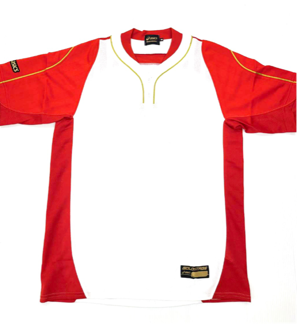 アシックス(ASICS)ベースボール ゴールドステージ プラクティスシャツ 半袖 品番:BAD010 カラー:0123(ホワイトxレッド) サイズ:S・M・L・O・XO・2XO(JASPO範囲表示) 素材 身頃:ストライプジャカード/ポリエステル100% 切替:インテイクメッシュFX/ポリエステル100% 詳細:細前立て仕様、右袖ワッペン採用 生産国:中国製