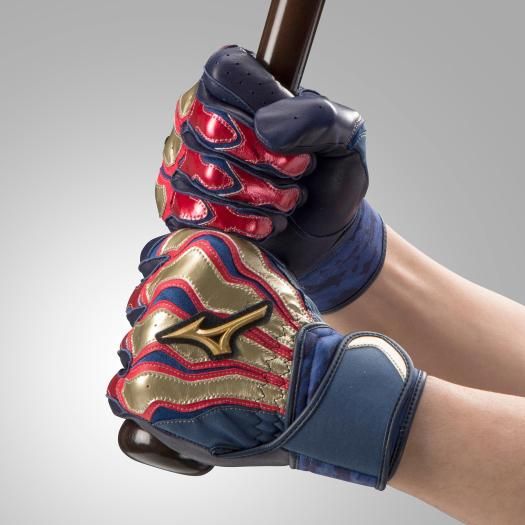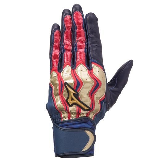 ミズノ(MIZUNO) ミズノプロ モーションアークSF バッティング手袋(両手用) 品番:1EJEA07714 カラー:14:ネイビー×レッド×ゴールド サイズ:23〜27cm 素材 掌部:羊革 甲部:合成皮革、羊革、ナイロン、ポリエステル、ポリウレタン 機能・特徴 モーションアークライン スムースモーションフィンガー ソフト&ライトシープレザー サムディープカット 圧縮クロロプレンベルト採用 原産国:インドネシア製