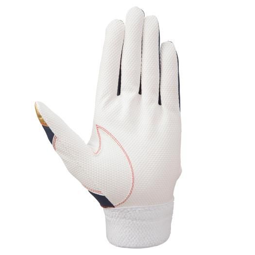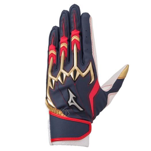 ミズノ(MIZUNO) バッティング手袋(両手用) シリコンパワーアークLI レプリカ 品番:1EJEA08714 カラー:14:ネイビー×レッド×ゴールド サイズ:23〜26cm 素材 掌部:合成皮革 甲部:合成皮革、ポリエステル、ナイロン、ポリウレタン 機能・特徴 パワーアークライン ワイドロングベルト採用 ダイヤエンボス合成皮革採用 単独水洗い可能モデル 原産国:ベトナム製、フィリピン製