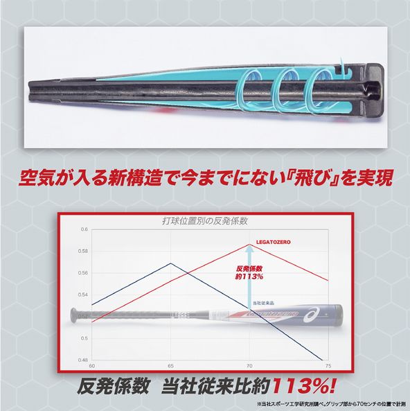 アシックス(asics) 軟式野球 新構造複合バット レガートゼロ(LEGATOZERO) 品番:3121A266 カラー:901:ゴールド×ブラック サイズ:84cm/725g 素材:本体/カーボン、合成皮革、合成ゴム/グリップ/ポリウレタン バランス:トップミドルバランス 直径:φ69.5mm ポンプ付き 機能・特徴 ・サッカーボールの構造を参考に生まれた、Air Bump構造 打球部に空気を注入する新しいカタチを実現したのがこのレガートゼロです。 アシックスの開発チームはサッカーボールの構造に着目し、この構造を作り上げました。 ・エアーの復元力が飛びを生む 「ウレタン以上の飛び」を求め、打撃時のウレタン素材のエネルギーロスに注目。 ウレタン以上の復元力を持つ「空気」を利用した構造にすることで、スウィングのエネルギーがより効率的にボールに伝わります。 反発性能は、従来の当社製ウレタンバットと比較して最大約13%向上しています。 ・反発性能が持続 ウレタン素材は打撃を繰り返すと素材が劣化し、反発性能が低下することがあります。 レガートゼロは当社ウレタン製バットと比較し、反発性能の低下が半分以下(※)と性能が維持する傾向にあるのも特長です。※2000回打撃時で比較 ・対象空気圧:2.5~3.5気圧【kgf/cm2】 (245.2~343.2kPa) バット内部の空気圧は、対象空気圧の範囲内で調整可能です。 使用者のスウィングスピードや打撃スタイルによって、飛びやすい空気圧は異なります。 「自分に合った空気圧を探すという、打撃の新たな楽しみ方」を提案します。 ・1日の使用前には空気圧チェックを 長期保管後の使用では、空気圧が低下していることもあります。 ・1日の使用前には、必ず空気圧をチェックし必要に応じて調整してください。 ・保管も丁寧にバットの中に空気が入る、これまでにない構造のバットです。 その反発性能を活かし長くご使用いただくためにも、商品に付属している取扱説明書の注意事項を遵守してください。