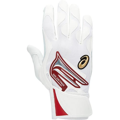 アシックス(asics) ゴールドステージ バッティング用手袋 両手用 品番:3121A633 カラー:ホワイト/レッド(108) サイズ:22~27cm 素材 ひら:天然皮革(シープ) 甲:合成皮革、ポリエステル、ナイロン 機能・特徴 パワーネット+伸縮材 立体構造 コンフォートバインド(逆巻きベルト) コンポジット構造 生産国:インドネシア