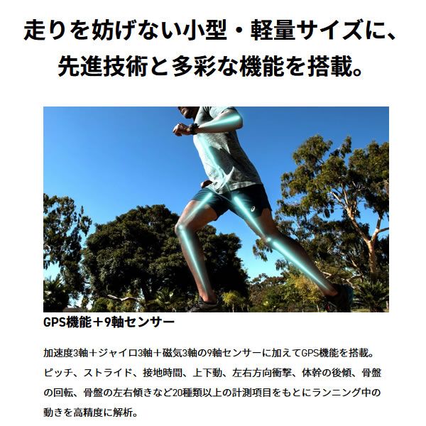 モーションセンサーを腰に装着することで、「骨盤」の動きから“ランニングフォーム”を細部まで解析することができます。