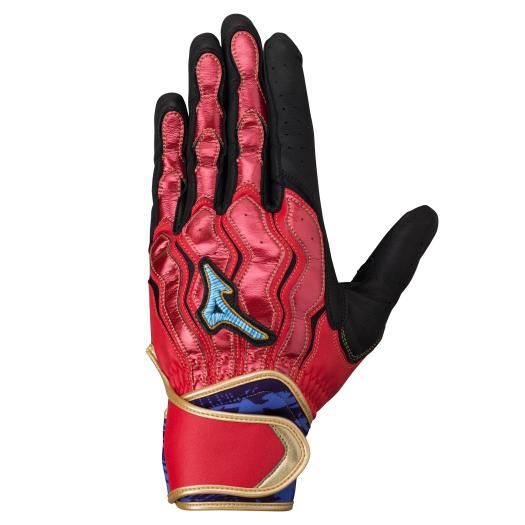 ミズノ(MIZUNO) ミズノプロ バッティング手袋 両手用 モーションアークSF 品番:1EJEA09162 カラー:62:レッド×ブラック×レッド(掌部カラー:ブラック) サイズ:22~27cm 素材 掌部:羊革 甲部:合成皮革、羊革、ナイロン、ポリエステル、ポリウレタン 機能・特徴 モーションアークライン(特許:4124793) 握り込む際の皮膚の変形挙動に合わせた手甲のカッティングを再現。 またグリップ時にテンションのかかる箇所へ伸縮素材を配置することで、グリップ時のストレスを緩和し、限りなく素手感覚に近づける手袋へ。
