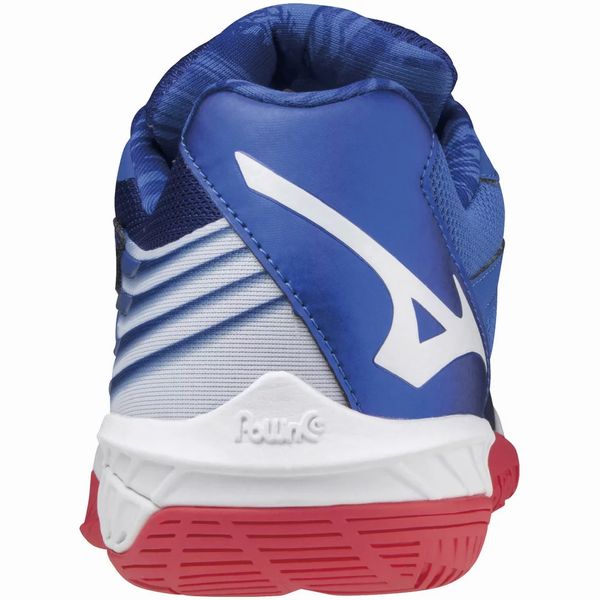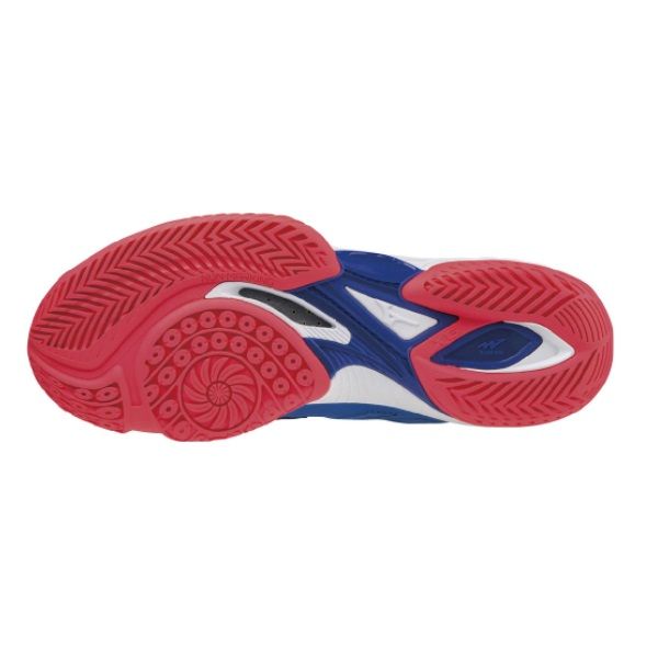 ミズノ(MIZUNO) バドミントンシューズ ウエーブクロー2 スペシャルエディション 品番:71GA211022 カラー:ブルー×ホワイト×ピンク(22) サイズ:23.0~28.5cm ウィズ:3E相当の方向け 質量:約310g(27.0cm片方) 素材 甲材:人工皮革×合成繊維 底材:合成底 インソール:マイルドクッションインソール(取り外し可) 機能・特徴 セパレートソール ラバー面積を少なくすることで軽量性を高めたセパレートソールに加え、内側へのねじれをしやすくするD-Flec Grooveを搭載。自然な蹴り出しをサポートし。「より速く」を実現する。 D-Flex Groove 中足部に斜め方向の屈曲溝を入れることで、自然な蹴りだしをサポート。 アウトリガー形状 外甲側の中足部を張り出させるソール構造が、安定感とステップの踏みやすさを高める。 ハーフブーティー構造 アッパー内部とタン部(ベロ)を一体構造にすることで、ソフトなフィッティングを実現。