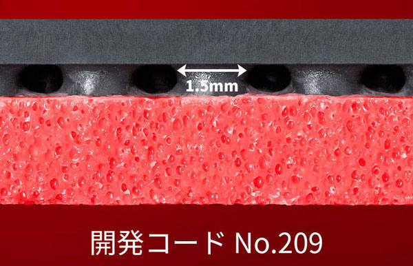 粘着力と弾みの両立をハイレベルで実現 ハイテンション効果を大幅にアップしつつも粘着性ラバーの特長が発揮される独自配合のシートと、硬めの「スプリング スポンジX」との相乗効果により、粘着力と弾みを高次元で両立。 “開発コードNo.209”のツブ形状が、回転量の多いドライブやカット、台上技術やカウンターのしやすさをもたらします。 粘着性ハイテンションの特長が向上した『ディグニクス09C』は、粘着性の打球感を求める選手のプレーをさらなる高みへと導きます。