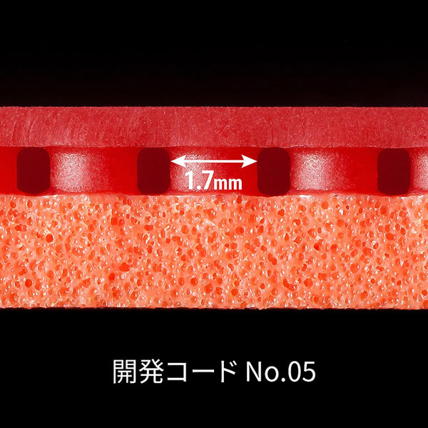 回転性能にさらなる威力を加えた『テナジー』 回転性能に優れる『テナジー05』に、さらなる威力を加えるため、より硬めのスポンジを採用したのが『テナジー05ハード』です。 「スプリング スポンジ」の特徴である、思い通りの打球を生み出す感覚を維持しつつ、ハードなスポンジが強いインパクトに応え、ワンランク上のパワープレーを可能にします。