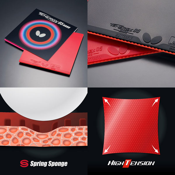 バタフライ(Butterfly) 卓球ラバー テナジー05 ハード 品番:06030 カラー:赤、黒 厚さ:アツ、トクアツ タイプ:ハイテンション裏ラバー テクノロジー:ハイテンション スプリング スポンジ スピード:13 スピン:11.5 スポンジ硬度:43 原産国:日本