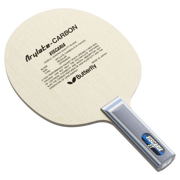 バタフライ(Butterfly) 卓球ラケット ビスカリア ST 品番:30044 素材:5枚合板+Arylate CARBON(アリレートカーボン)2枚 戦型:攻撃用シェーク ブレード:形状/レギュラー、サイズ/157×150mm、ブレード厚/5.8mm グリップサイズ:ST/100×23mm、グリップ厚/28mm 重量:82g± 仕様:タイプ/攻撃用、反発特性/11.8、振動特性/10.3 公認:(公財)日本卓球協会公認(J.T.T.A.A.) 原産国:日本
