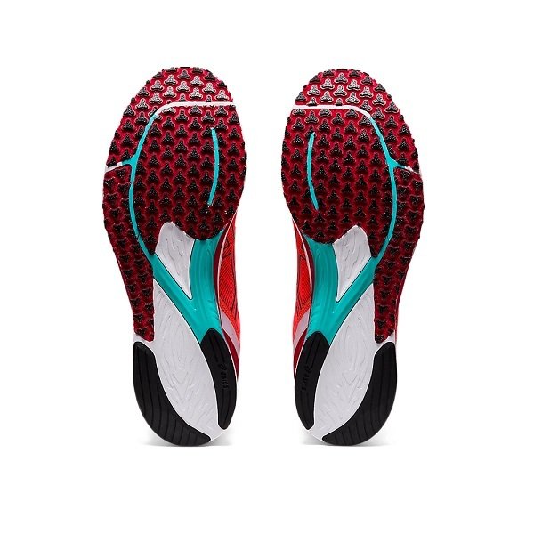 追従するFIT”をコンセプトに、フィット性を向上させたサブ3を狙うランナーのためのハイエンドレーシングモデル。アッパー素材にせん断変形するメッシュ材、アダプトメッシュ2.0を採用することで、中足部の足沿いが向上しフィット性がアップ。また、アッパー内部にはキックバック性の強いフィルム補強を配置。蹴り出し時のソールの追従性を高め、スピード走行時のフィット感を向上させています。アシックスストライプをくり抜きにし伸縮しやすい設計にすることで、この機能を高めています(DYNAMIC PROPULSION FIT)。軽量性とグリップ性を両立させ、路面を噛むようなグリップ力を発揮するデュオソール、反発性を高めてスムーズな蹴り出しをサポートするプロパルションプレートなど、速く走るための機能も充実。進化したフィット感で確かな走りを可能にします。