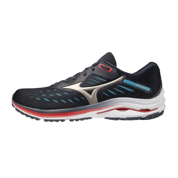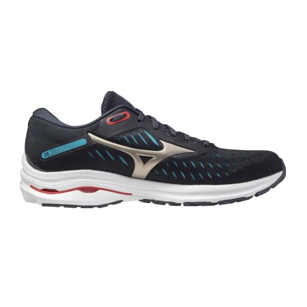 ミズノ MIZUNO ランニングシューズ ウエーブライダー 24 品番:J1GC2003 カラー:42(ブルー×ゴールド×オレンジ) サイズ:24.5~29.0、30.0cm(2E相当) 質量:約275g(27.0cm片方) 甲材:合成繊維、人工皮革 底材:合成底 インソール:プレミアムインソール(取り外し可) 生産国:ベトナム