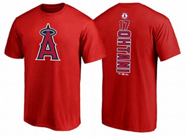 ロサンゼルス・エンジェルスのロゴを胸に、大谷翔平選手の名前と背番号を背中にプリントしたジュニア用Tシャツ