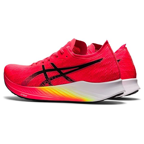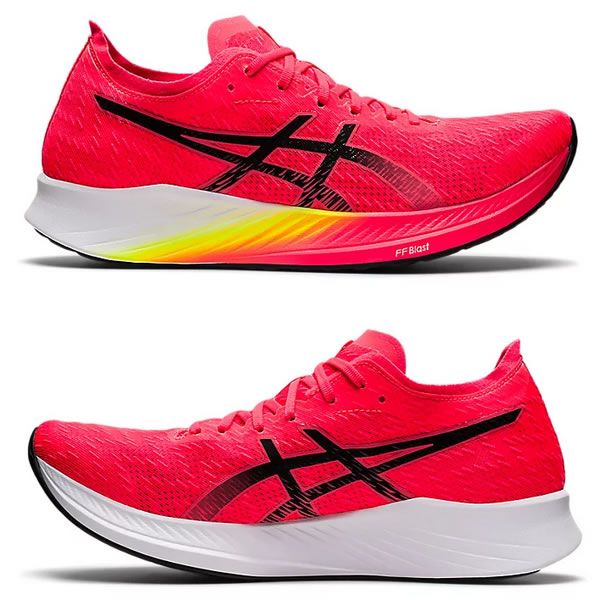 優れた走行効率性と、クッション性・反発性を併せもつレーシングモデル MAGIC SPEED。 アシックスレーシングモデルにおける最高峰のシューズのひとつ、METASPEED SERIESの機能・デザインを引き継いだMAGIC SPEEDは、優れた走行効率性と、 クッション性・反発性をあわせもつモデルです。つま先が弓状に上がったガイドソールテクノロジーに、軽量のカーボンプレートを搭載。 ソールの形状を維持し重心の移動を促すことで、蹴り出しのスピードを高めると同時に、エネルギーの消費を抑えます。