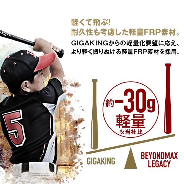 ミズノ(MIZUNO) 少年軟式用バット ビヨンドマックスレガシー 品番:1CJBY161 カラー:ブラック×ゴールド(0950) サイズ 78cm/平均560g(1CJBY16178) 80cm/平均570g(1CJBY16180) 最大径:平均φ69mm バランス:トップバランス(ロングヒッター向き) 素材:カーボン+グラス+ミズノレガシーPUフォーム グリップテープ:2ZT210 機能・特徴 ウレタン素材「ミズノレガシーPUフォーム」が飛びにさらなるパワーをのせる 従来と比べて、ウレタン素材「ミズノレガシーPUフォーム」を採用したことで、反発力が高まり、従来のビヨンドにはない飛距離を実現します。約3.3%アップ(ミズノ比)。 軽くて飛ぶ!耐久性も考慮した軽量FRP素材 GIGAKINGからの軽量化要望に応え、より軽く振りぬける軽量FRP素材を採用。約30g軽量(ミズノ比)。 付属品:専用バットケース 生産国:中国