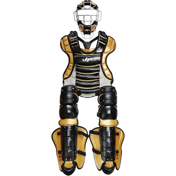 ハタケヤマ(HATAKEYAMA) 一般軟式用 キャッチャー防具3点セット 品番:CG-N22BG カラー:ブラック×ゴールド セット内容:マスク、プロテクター、レガース 付属品:専用袋 (財)全日本軟式野球連盟公認 SGマーク合格品 原産国:日本