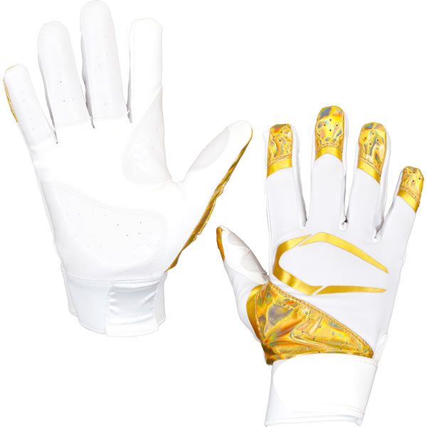 カッターズ(CUTTERS) バッティング手袋 両手用 パワーコントロール 3.0 品番:B442 カラー:ホワイト×イリディセントゴールド(WIG) サイズ S(16.3-18.0cm) M(18.0-18.8cm) L(18.8-19.6cm) XL(19.5-20.3cm) 人差し指の先端~手首までの長さ 素材:合成皮革 機能・特徴 革新的グリップ素材「C-TACK」:独自のグリップ素材が高いグリップ力と耐久性を実現。 復活するグリップ力:湿らせた布や水で汚れを落とせばグリップ力が何度でも復活。 全天候対応:晴れでも、雨でも、驚異のグリップ力を発揮 丸洗い可能 原産国:インドネシア