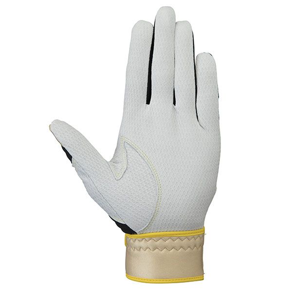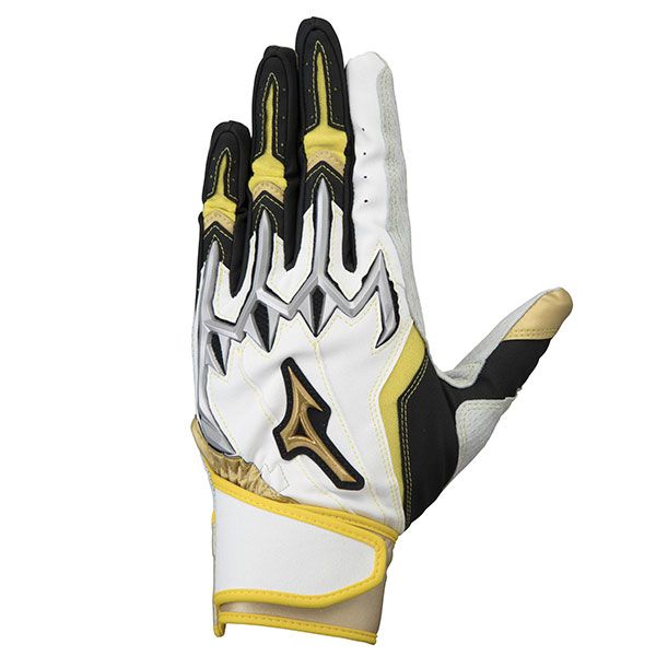 ミズノ(MIZUNO) ミズノプロ バッティング手袋 両手用 シリコンパワーアークLI 品番:1EJEA808 カラー:01:ホワイト×ゴールド×イエロー サイズ:22~27cm 素材 掌部:羊革 甲部:合成皮革、ポリエステル、ナイロン、ポリウレタン 機能・特徴 パワーアークライン グリップを握る際に最も重要な3本指にシリコーン樹脂パーツを配置し、握る際にテンションをかけることで、握り返す力を生み出します。 さらにそのパーツを連結させることで、単独では発揮する力の弱い薬指・小指をサポートし、スイング時のパワーロスを最小限に抑えインパクトへ繋げます。 ダイヤエンボスシープレザー(掌部) 天然皮革の弱点である汗によるグリップカ低下を軽減させるウォッシャブル加工を施したオリジナル羊革。 ロジンテック加工を加えることで、ドライ時はもちろんウェット時も高いグリップ力を保ちます。 圧縮ウレタンベルト採用(手首部) 従来品よりも柔らかな装着性を体感できる限定素材です。 オーダーでも選択できないプロのこだわりをぜひ体感ください。 パワーアーク専用指先独自縫製 ミズノ独自の指先縫製により、指先との密着感が一段とアップ。 指の力がスムーズにグリップへと伝わる。 原産国:ベトナム製、フィリピン製